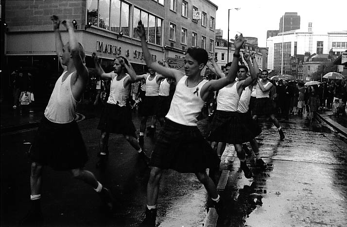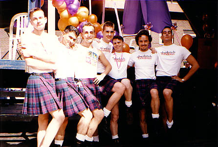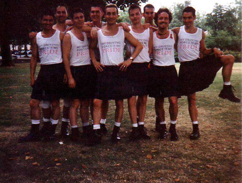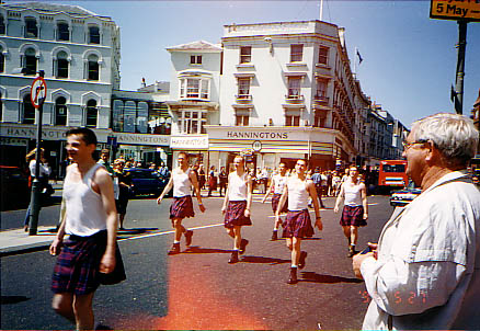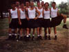White vests, kilts, boots.