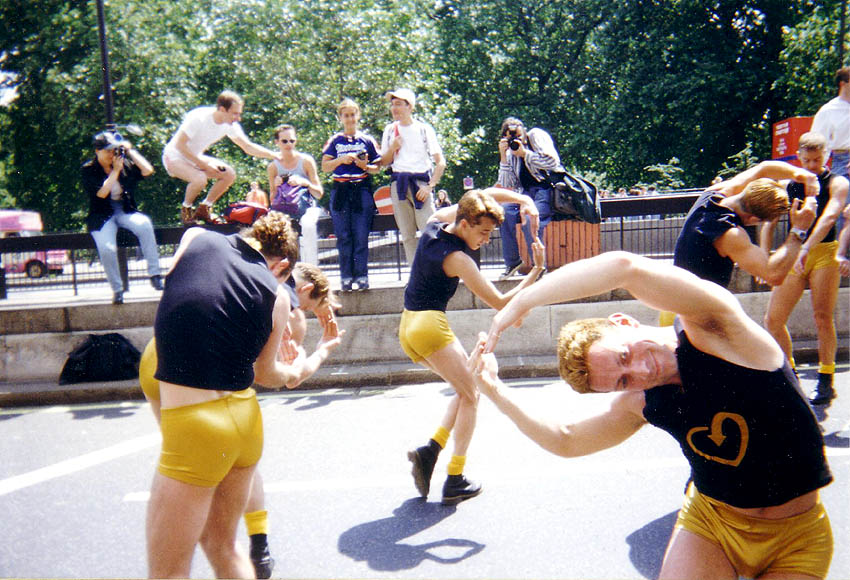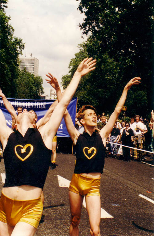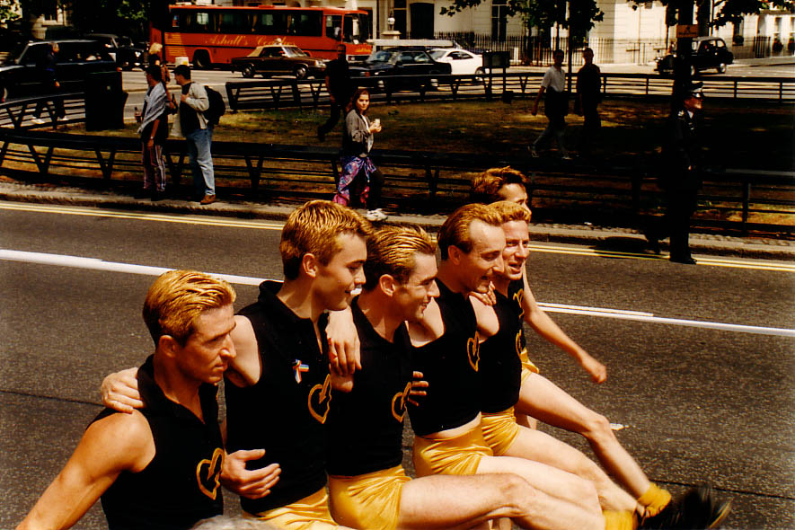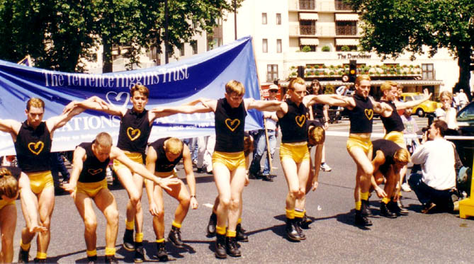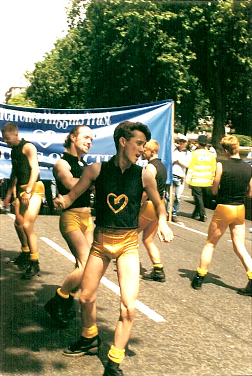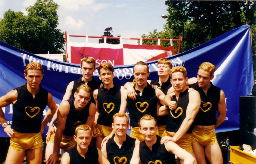 Black sleeveless polo shirts with gold THT heart logo, gold shorts, yellow socks, black boots, gold hair glitter