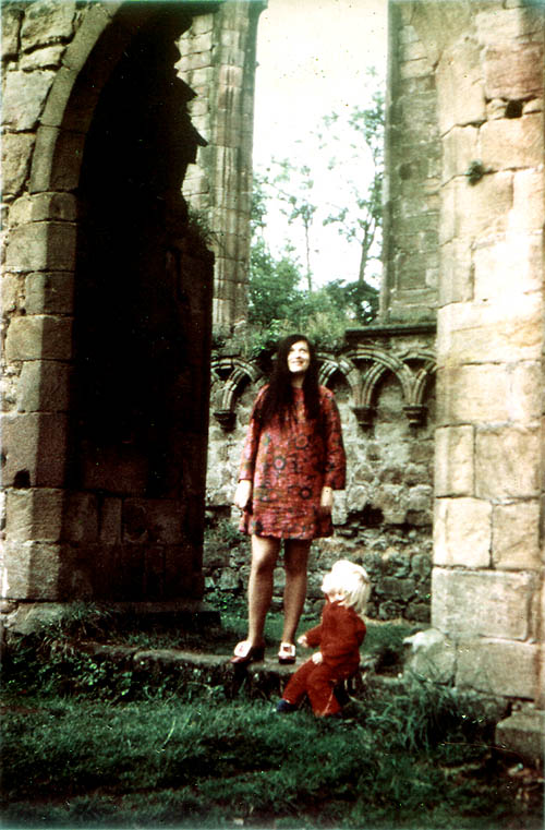 Forget the guy with the camel, this is how I'd like to be remembered. The precocious, attentive two-year-old with an appetite for life. Gazing devotedly up at my beautiful, smiling, pregnant, hippy mother -- look at that hair! that dress! those shoes! -- clad in fiery red, all blond and wide-eyed, surrounded by the ruins of religion: a revolutionary angel full of hope and potential.